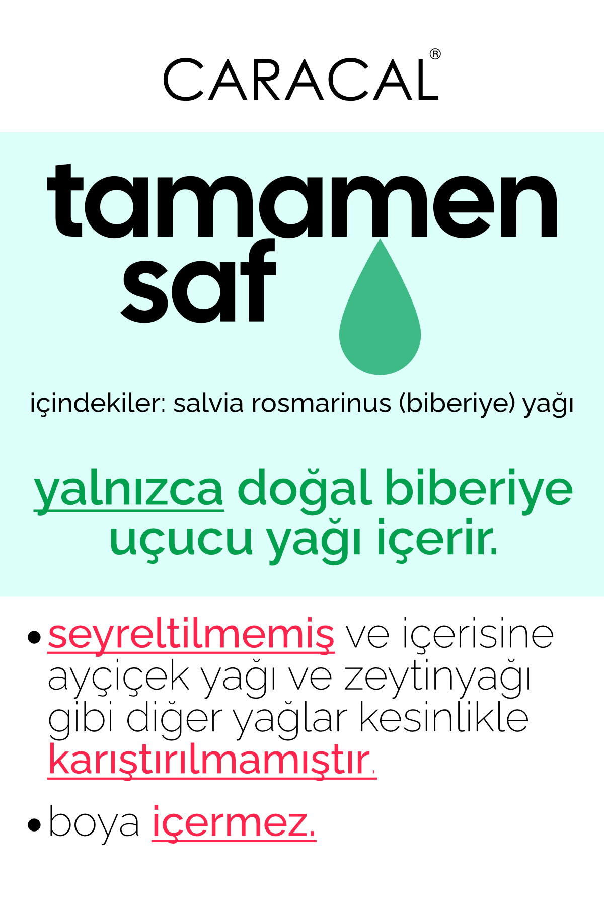 - 30 ml’lik damlalıklı cam şişede yalnızca doğal saf uçucu biberiye (Salvia Rosmarinus) yağı içerir.